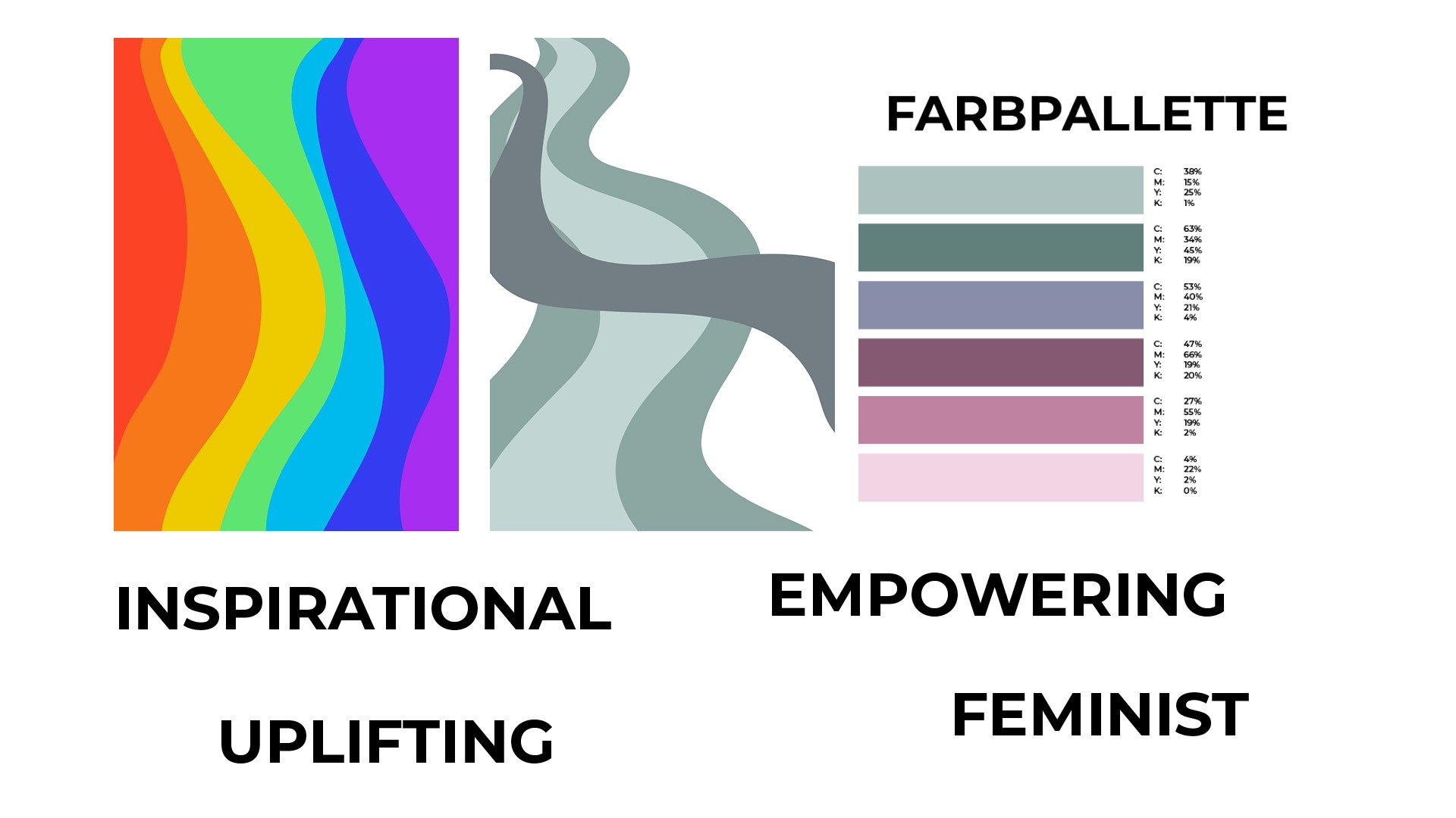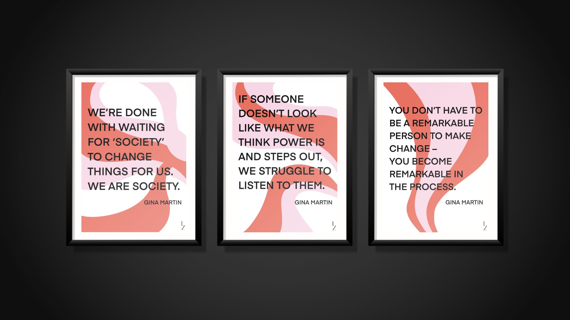 I started drawing random lines and then filling them in. The colors for Gina Martin's quotes were easy, red and pink were her signature colors at that time. For the rest of the series it was a process to get to the muted color pallette shown. While creating I always had those words in my mind. Because the background turned out to be a bit show stealing I knew the font had to be strong, modern and easily readable.